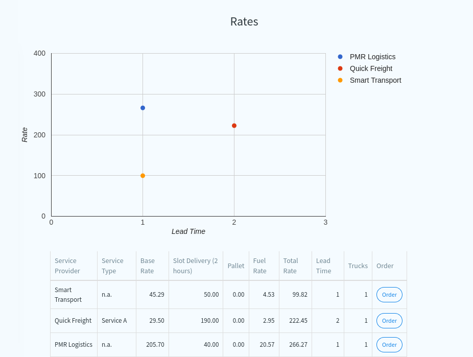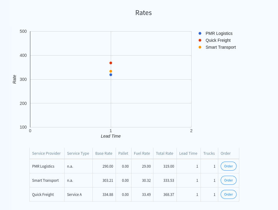For a specific loading location, destination, and volume/weight, the available transport rates are presented with the click of a button. A graph and table show the total prices of the available transporters, including the applicable fuel surcharge and any other selected surcharges for services required. The transit time is also displayed. The best option for a shipment can be easily be selected from the available rates. With our “Order” module, a transport order can be placed directly.